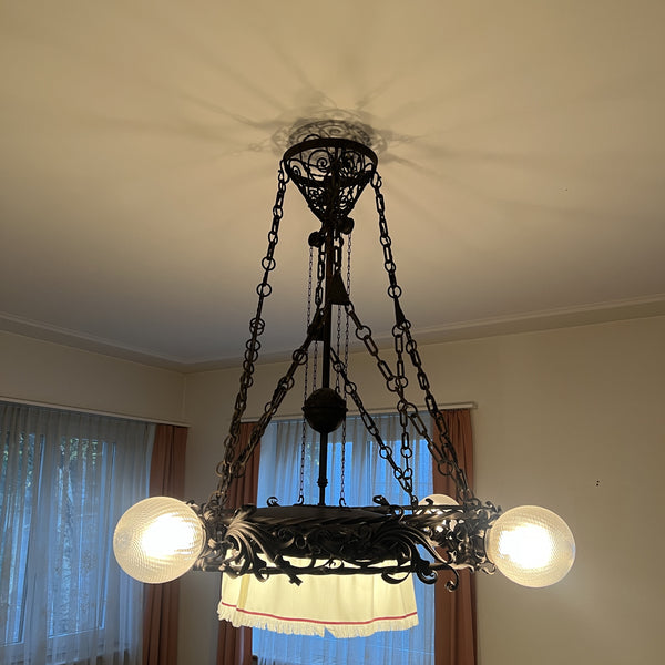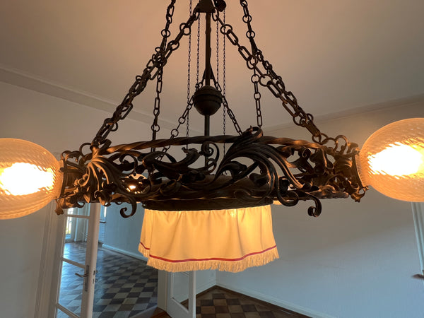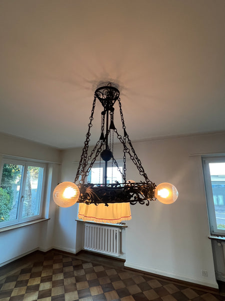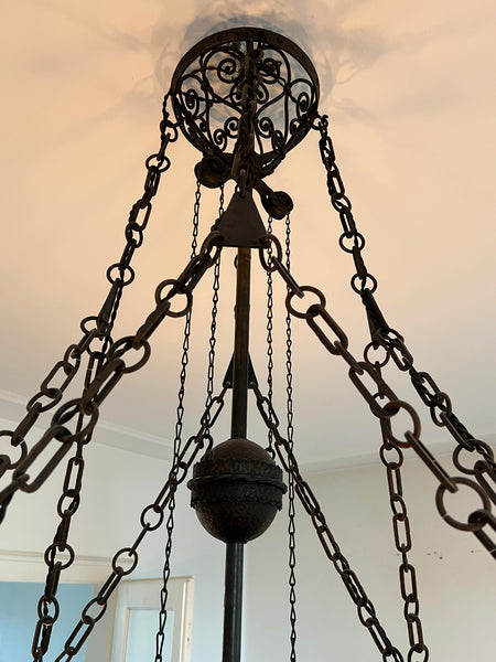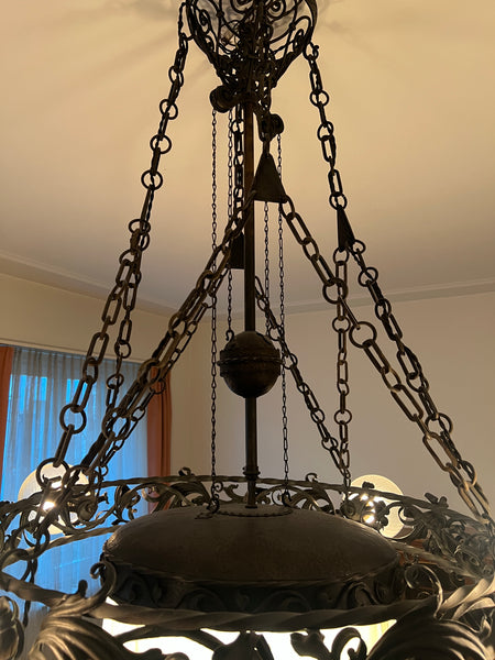 grosser Leuchter, schmiedeeisern mit 4 seitlichen Leuchten und Mittelleuchte, ca. Ø 120 x H 110 cm