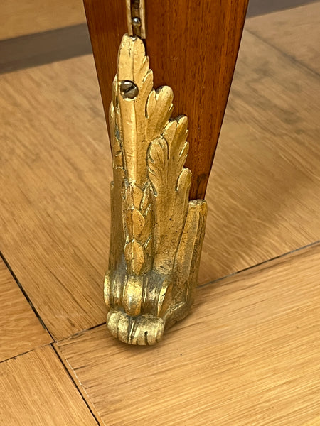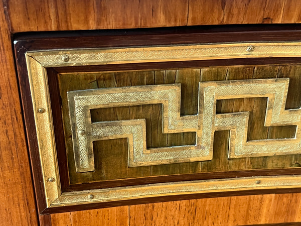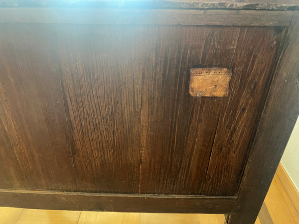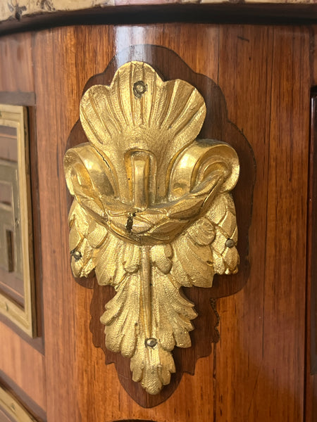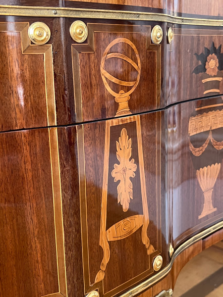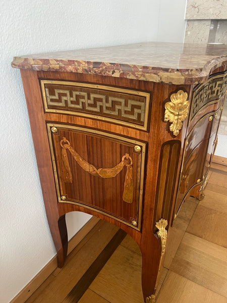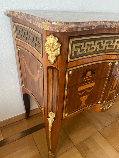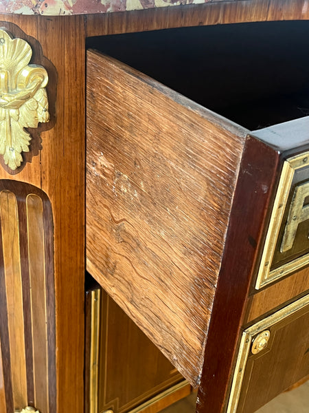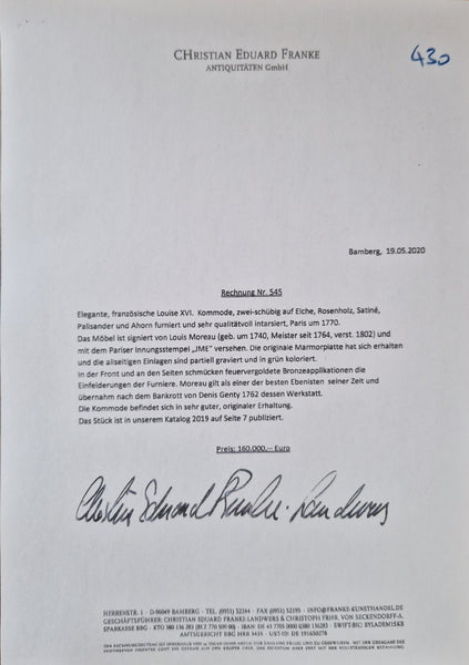 französische Louis XVI, Kommode, zweischübig auf Eiche, Rosenholz, Satiné, Palisander und Ahorn furniert, Marmorplatte, Front und Seiten mit feuervergoldeten Bronzeapplikationen, Paris um 1770, signiert und Innungsstempel "IME", ca. B 92 x T 48 x H 86 cm, erworben für Euro 160'000.00 in der Kunsthandlung Christian Eduard Franke, Bamberg (siehe Rechnung)