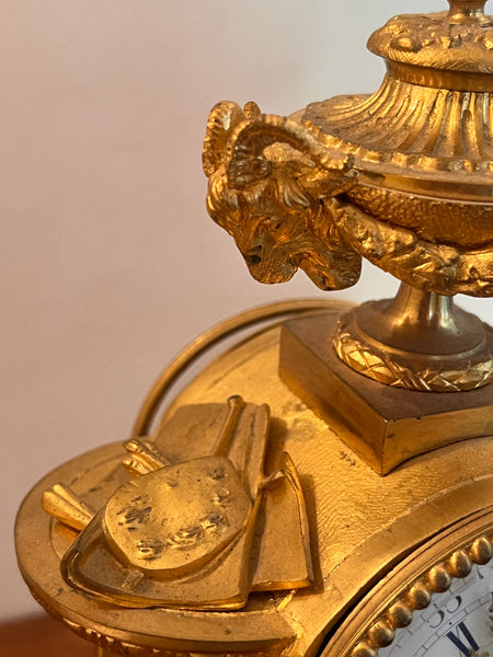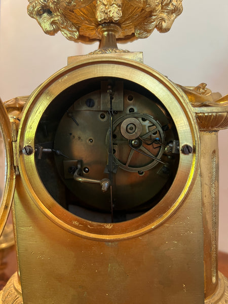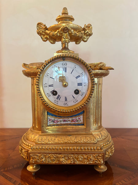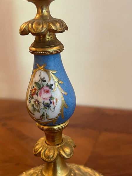 3-teilig, franz. Tischpendule, feuervergoldet und Sèvres Porzellan, ca. H 30 cm mit passenden Kerzenständer, je ca. H 16 cm