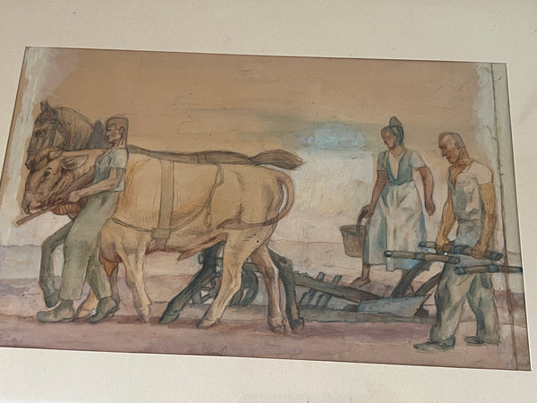 4 Aquarelle, davon 1 x ohne Rahmen, "Rehe" ca. B 36 x H 30 cm; "Fuhrwerk" ca. B 48 x H 36 cm; "Fischer" ca. B 33 x H 38 cm; "Fraumit Krug, ca. 35 x 35 cm