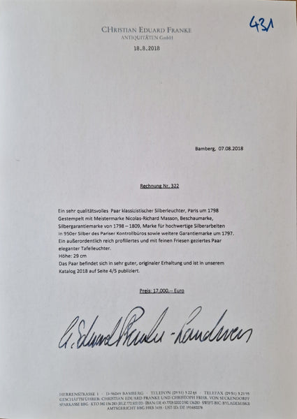klassizistische Silberleuchter, Paris um 1798, gest. Nicolas-Richard Masson, erworben für Euro 17'000.00 in der Kunsthandlung Christian Eduard Franke, Bamberg (siehe Rechnung)