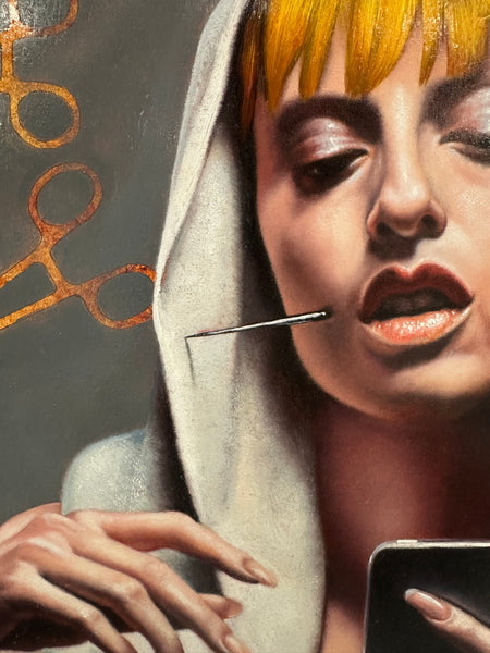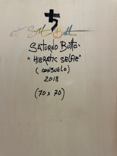 Oel/Holz "Hieratic Selfie" (Consuelo), 2018, Bildgrösse ca. 70 x 70 cm