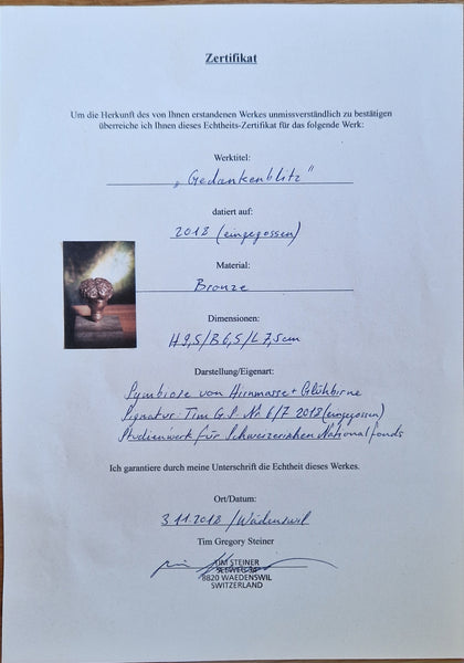 Bronzeskulptur "Gedankenblitz", signiert und datiert 2018, 6/7, H 9.5 x B 6.5 x L 7.5 cm
